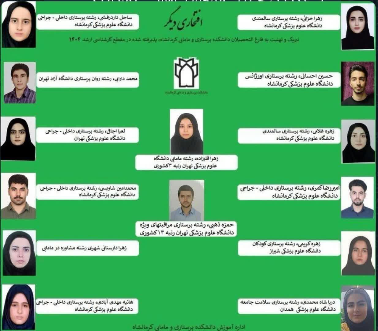 پذیرش این عزیزان در رشتههای تخصصی پرستاری و مامایی، بدون تردید، حاصل تلاش مستمر، انگیزه علمی و شایستگی فردی ایشان است. این موفقیت ارزشمند همچنین بازتابی روشن از همت، همراهی و تعهد علمی اساتید فرهیخته و کارکنان دلسوز و پرتلاش دانشکده در تمامی بخشهاست.